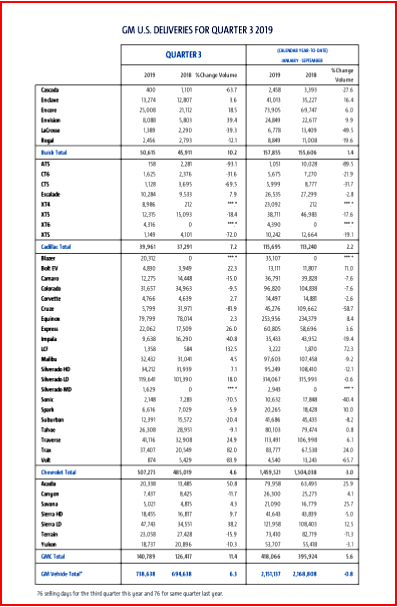 General Motors Co. (NYSE: GM) dealerships delivered 738,638 vehicles in the United States in the third quarter of 2019, an increase of 6.3% compared to the third quarter of 2018. GM’s fleet mix of total sales was 19.5 %, down 0.3%, year over year. End of September inventory was 759,633 units. Thus far the GM UAW strike has had little effect on sales.