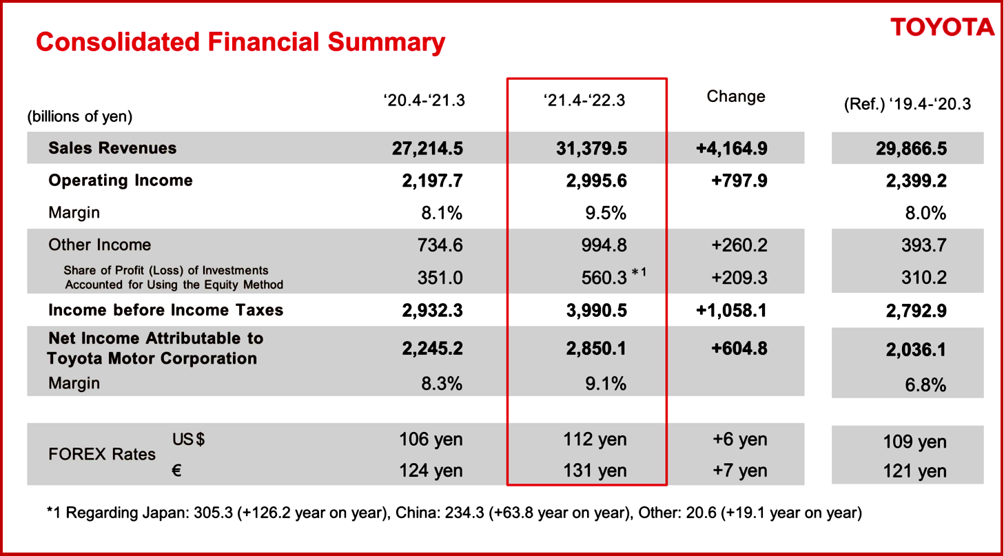 The sales produced consolidated financial results for this fiscal year at revenues of 31 trillion 379.5 billion yen. Operating income was 2 trillion 995.6 billion yen. Income before income taxes were 3 trillion 990.5 billion yen. This added to a net income of 2 trillion 850.1 billion yen.