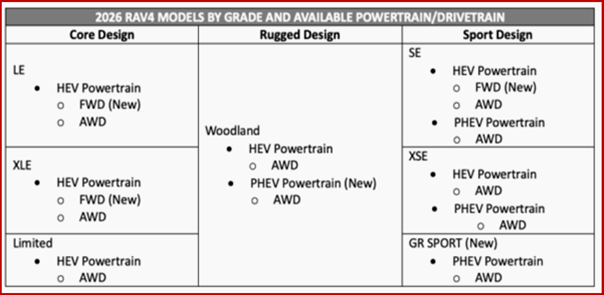 The 2026 RAV4 also joins Toyota’s list of exclusively electrified models. It will be available with Hybrid Electric Vehicle (HEV) or Plug-in Hybrid Electric Vehicle (PHEV) powertrains. RAV4 also launches new technologies for Toyota, including the Arene software development platform, a new version of the Toyota Audio Multimedia system, and updates to the Toyota Safety Sense active safety suite. Toyota might say customer choice is paramount, but it comes with a bewildering array of options and packages to climb over that are the antonym of the once famous Honda tagline “We Make it Simple.”