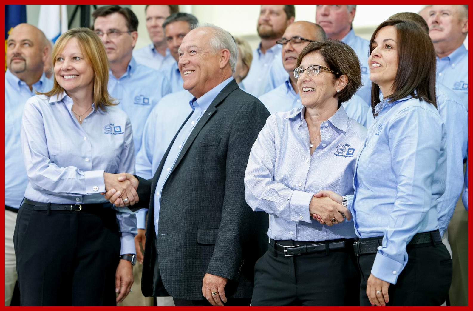 General Motors CEO Mary Barra (l to r), United Auto Workers President Dennis Williams, GM Vice President North America Manufacturing and Labor Relations Cathy Clegg and UAW Vice President GM Department Cindy Estrada shake hands at the opening of contract negotiations .