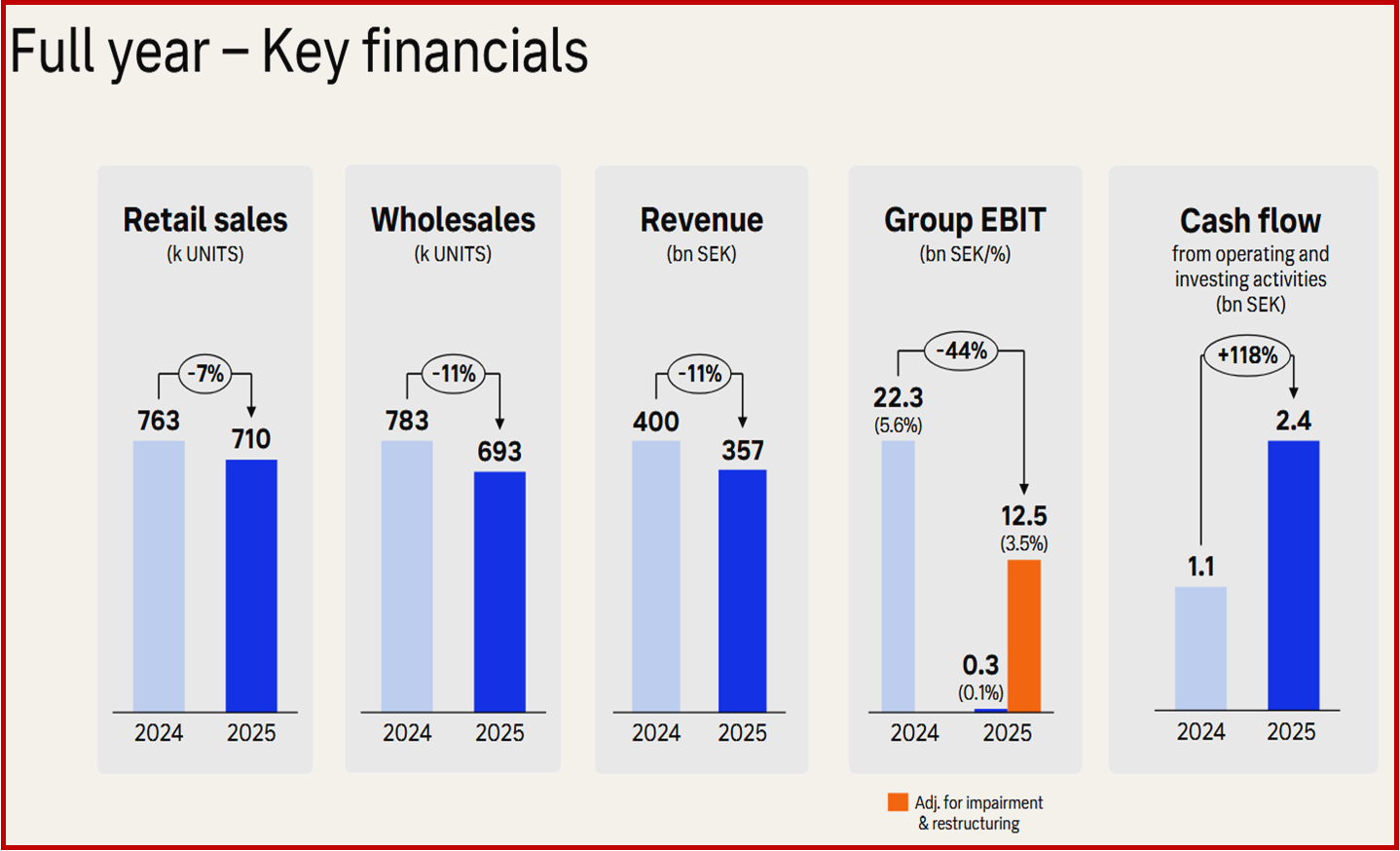 “The company’s fourth quarter performance was affected by several external factors, such as EU-US import tariffs and the negative currency effect of a stronger Swedish krona. On top of that, revenues were affected by weak demand putting pressure on pricing and the removal of EV incentives in the US, which negatively impacted sales in the quarter.