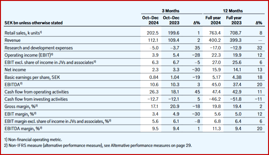 “Gross margins for the fourth quarter came in at 17.1%, impacted by a one-time effect from the sale of on-balance sheet cars. This increased both revenue and cost of sales and lowered the Q4 gross margin. Volvo Cars also saw a considerably larger decrease in inventory during Q4 compared to the previous year, which further impacted gross margins. Margins were also affected by car line and sales channel mix as well as pricing pressure in the market, but this was partially offset by a more efficient cost structure for new car sales,” Volvo said.