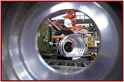 An Alcoan of Alcoa Wheel Products – Europe in Székesfehérvár, Hungary checks the dimensions of a forged vehicle wheel.